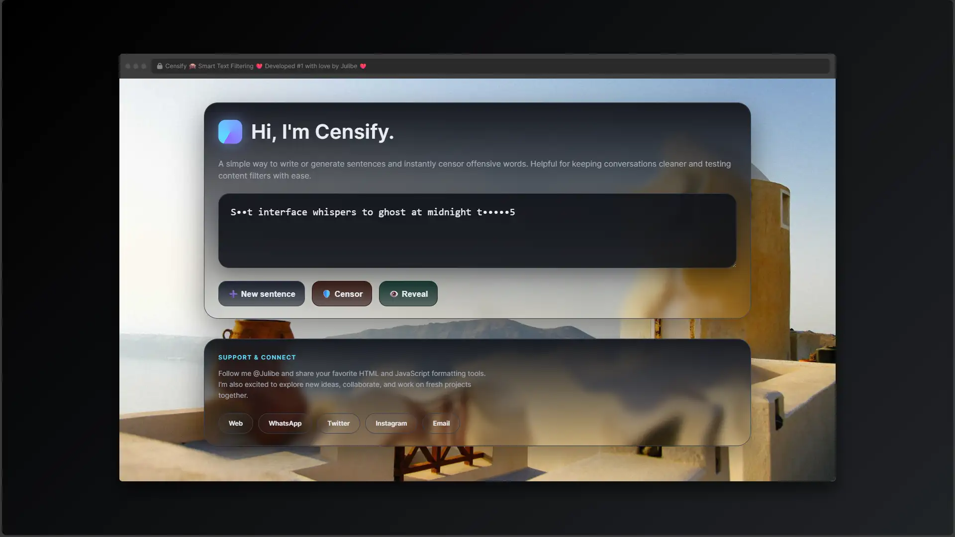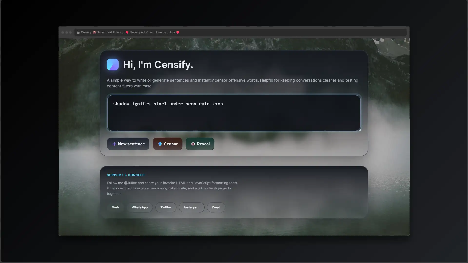 Wrapped in a gorgeous, animated glassmorphism interface, this app ensures that you remain in a state of blissful, forced innocence. Just paste the scary text, click “Censor,” and voilà! The bad words disappear, and we can all go back to pretending the internet is made entirely of rainbows, kittens, and polite discourse!