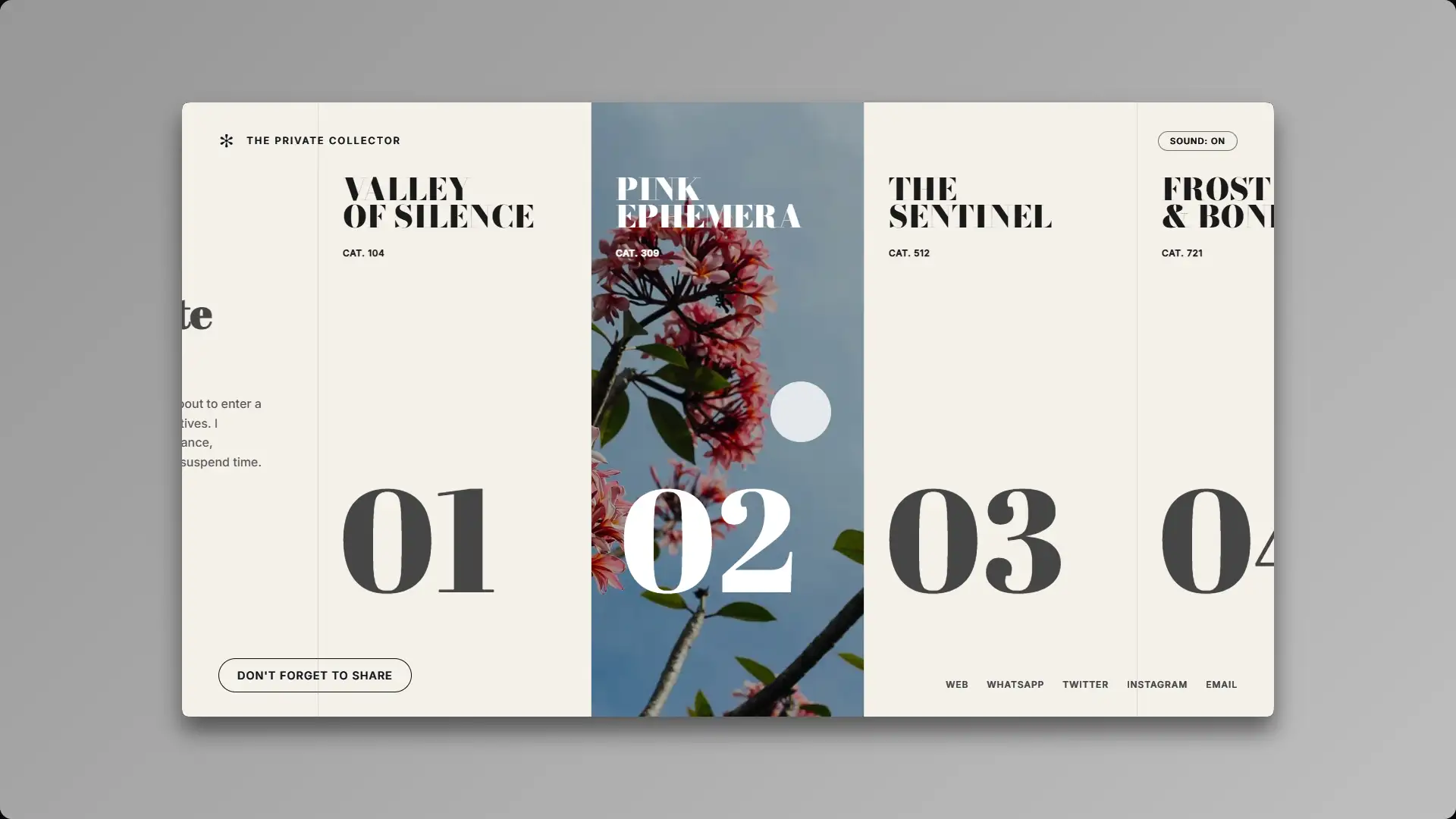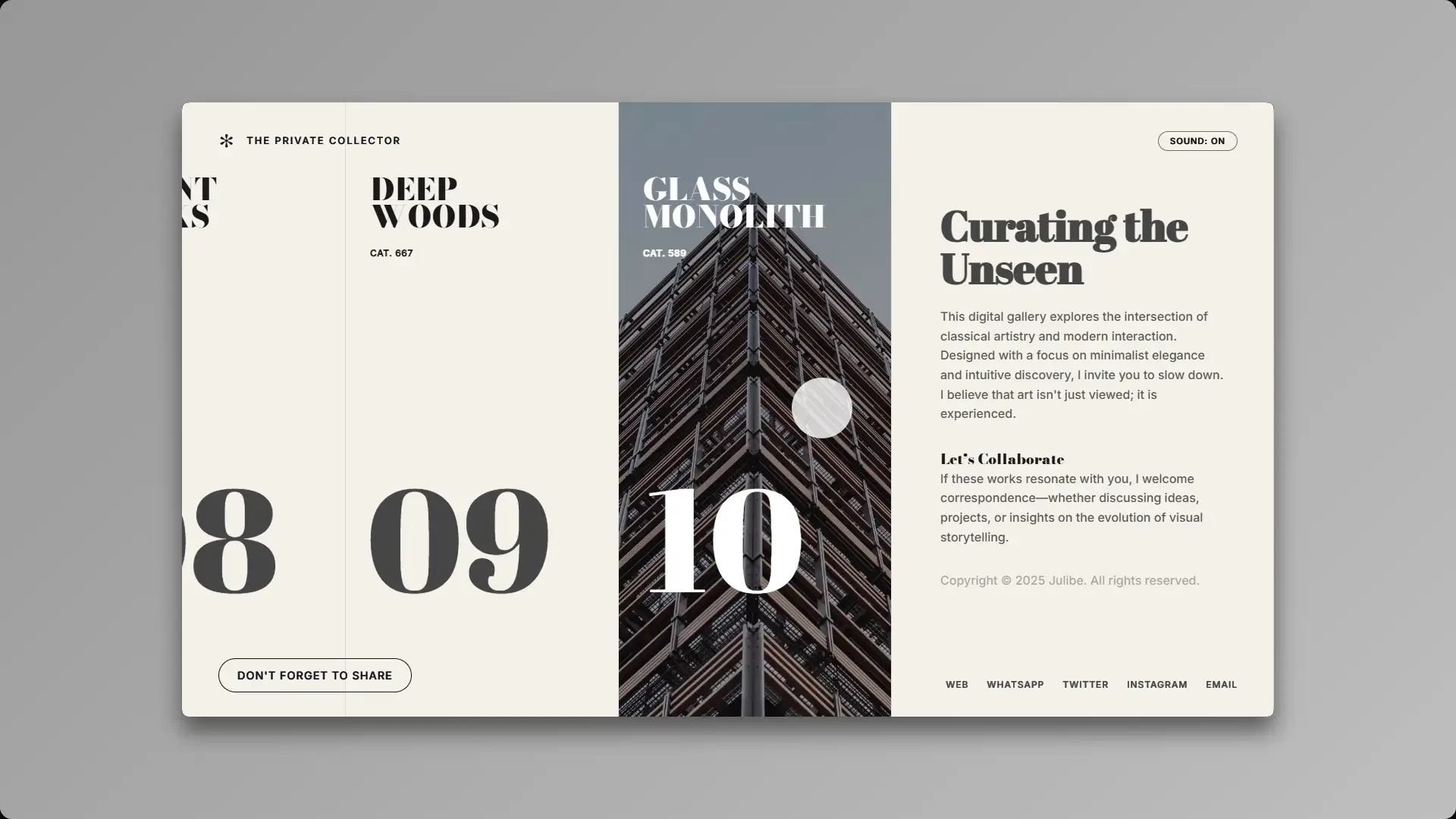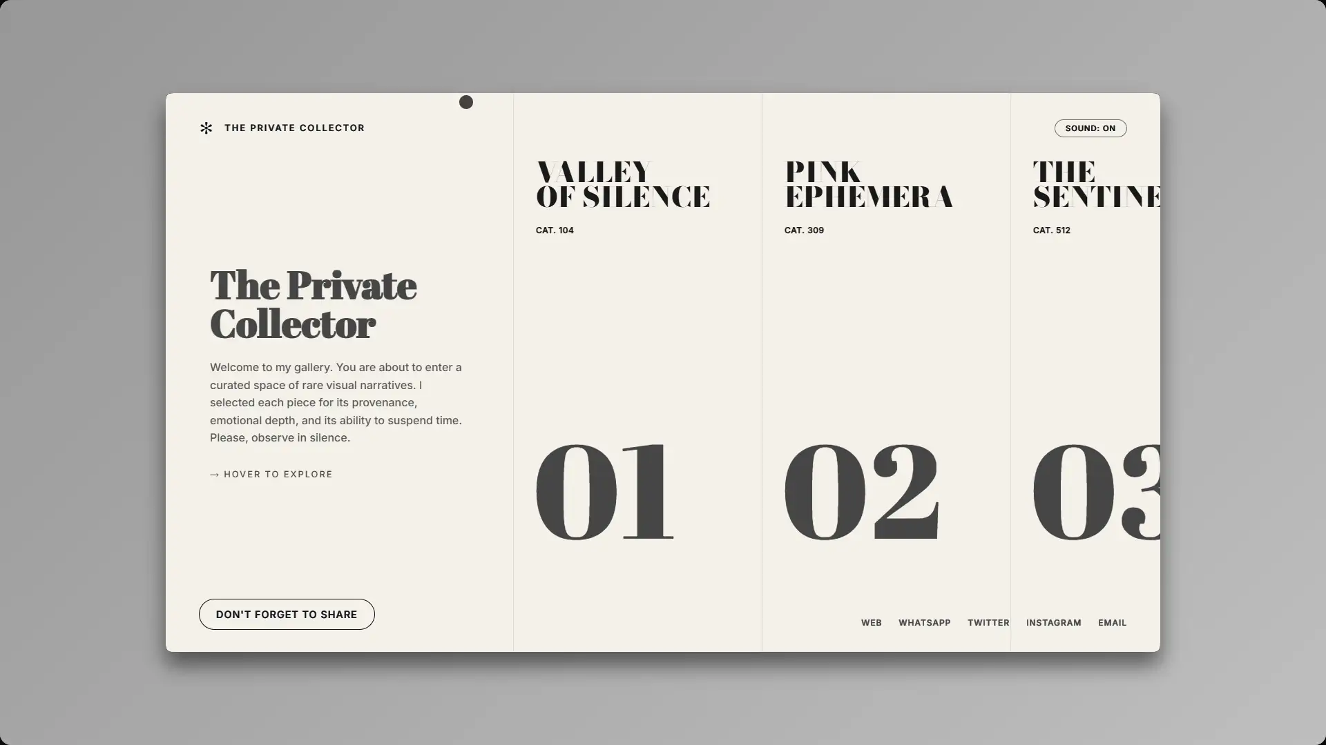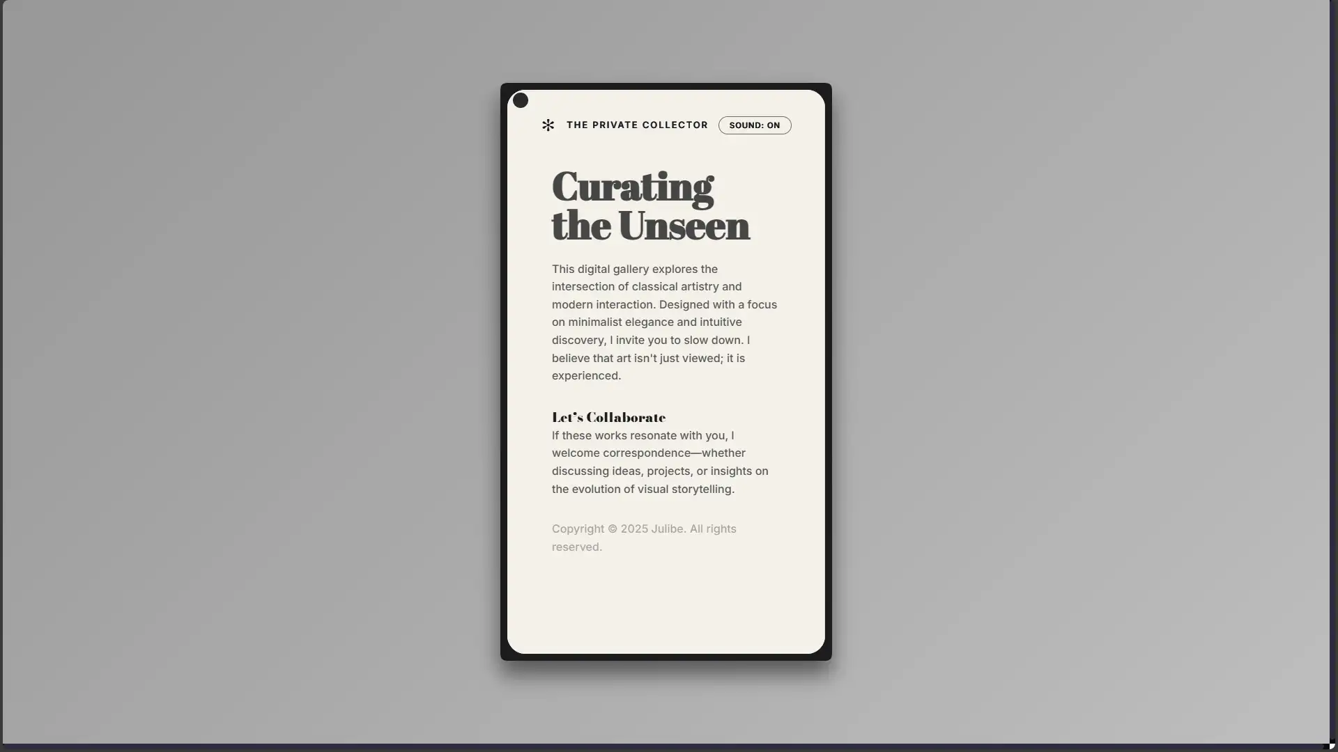 By orchestrating a flawless union of horizontal navigation and atmospheric soundscapes, I have transcended the mundane browser window. This is no mere website; it is an institution. Prepare yourself to experience artistry with the quiet reverence it so desperately deserves.